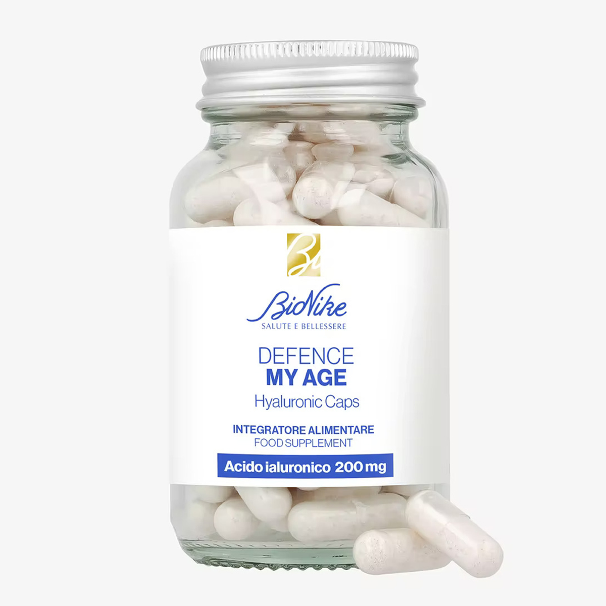 Suplement ushqyes me Acidi Hialuronik me gamë të plotë të peshës molekulare, i cili ndihmon për të përmirësuar kompaktësinë e lëkurës dhe pamjen e rrudhave. Vitamina C nxit prdhimin e kolagjenit për funksionimin normal të lëkurës.